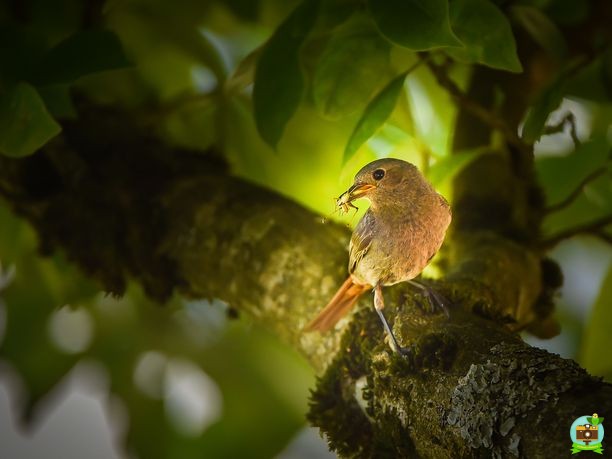 Cette photographie saisit une femelle rougequeue prête à rejoindre son nid, un insecte délicatement maintenu dans son bec pour nourrir ses petits.