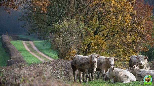 La douceur des collines, les couleurs flamboyantes de la saison et la présence paisible des emblématiques bœufs charolais offrent une scène vivante et chaleureuse de la campagne bourguignonne.